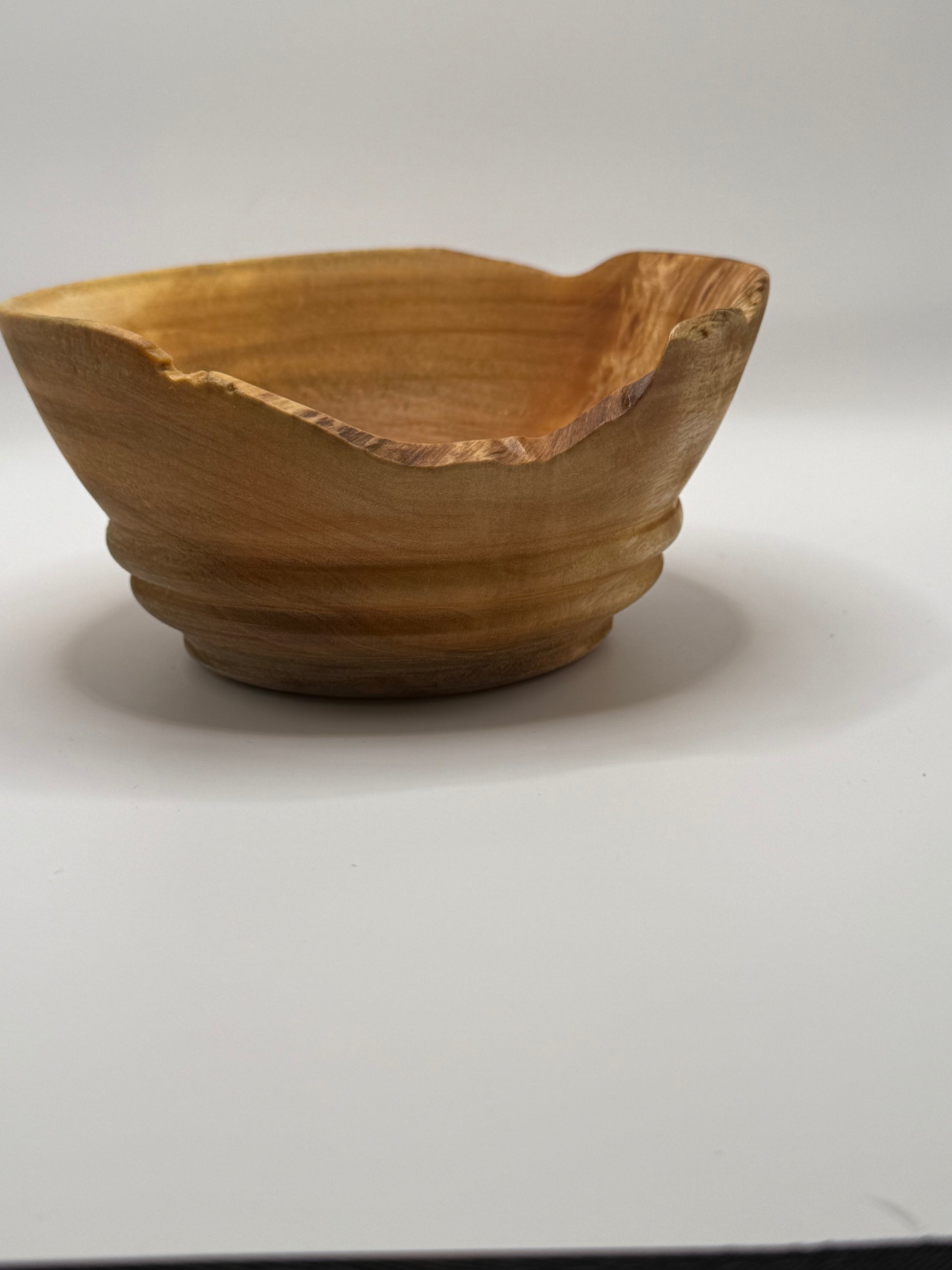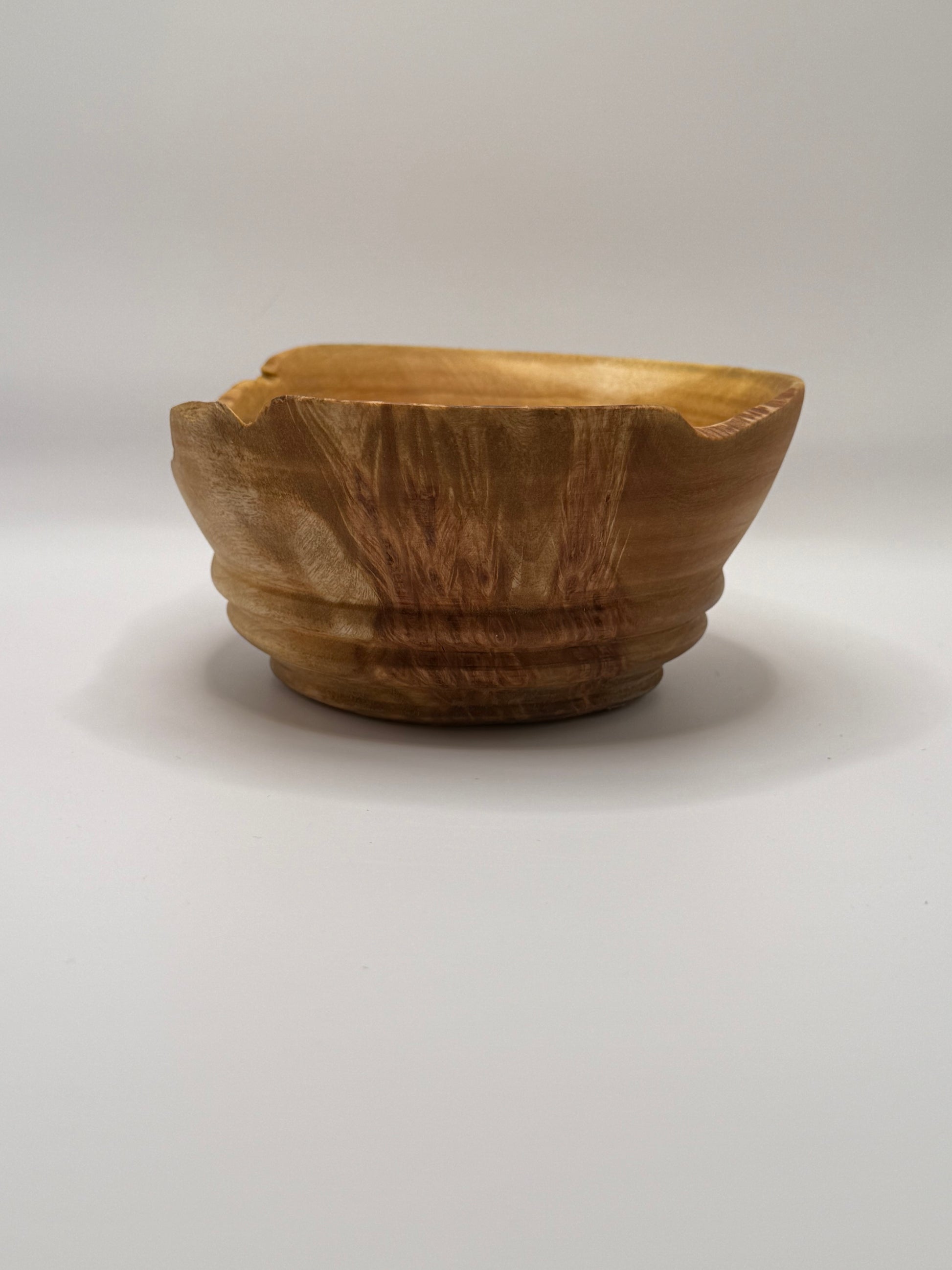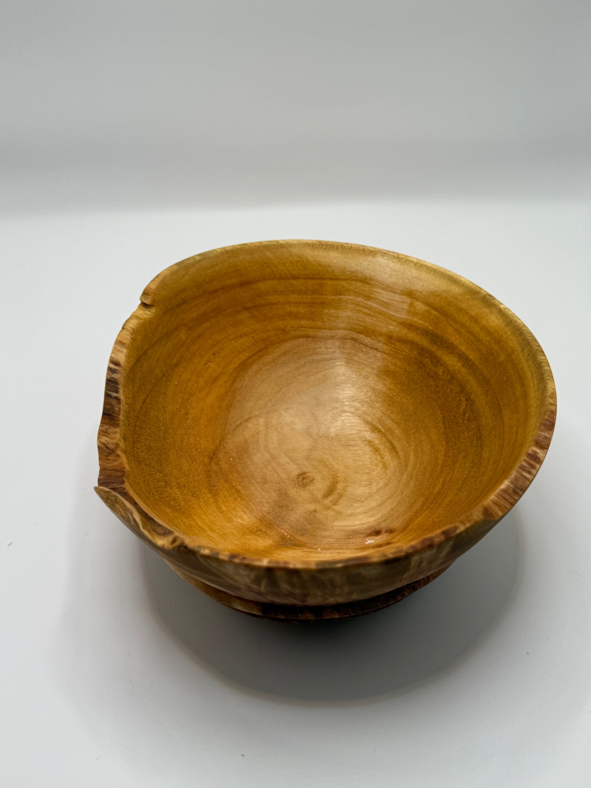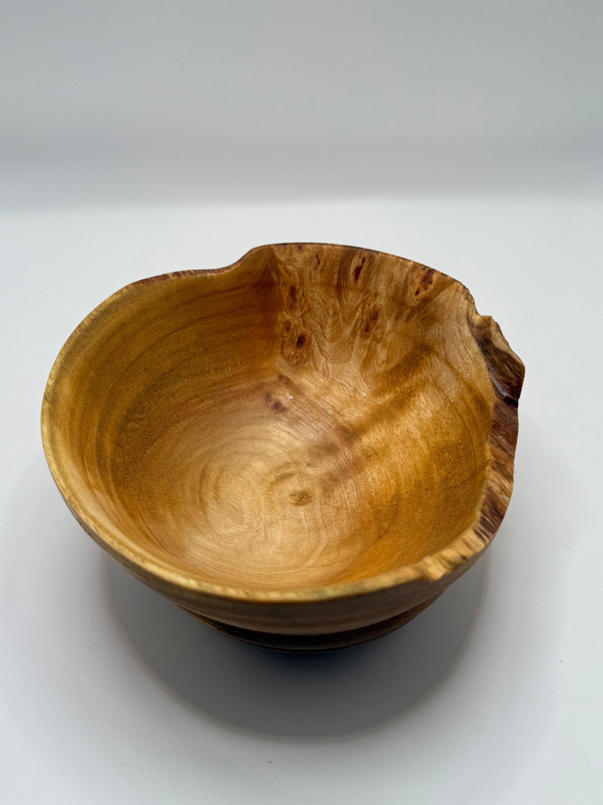 A stunningly beautiful living edge bowl made from Burled California Black Cottonwood. The trees ecsquisit figure is magnified by the shape of this rim. With rippled wood creating a fire like effect. This is a wonderful display piece for a front entry or a coffee table. Lathe turned with a thick base to prevent tipping. Finished with beeswax and mineral oil for a buffable shine that will last years. Measures four inches in diameter and stands four inches tall.